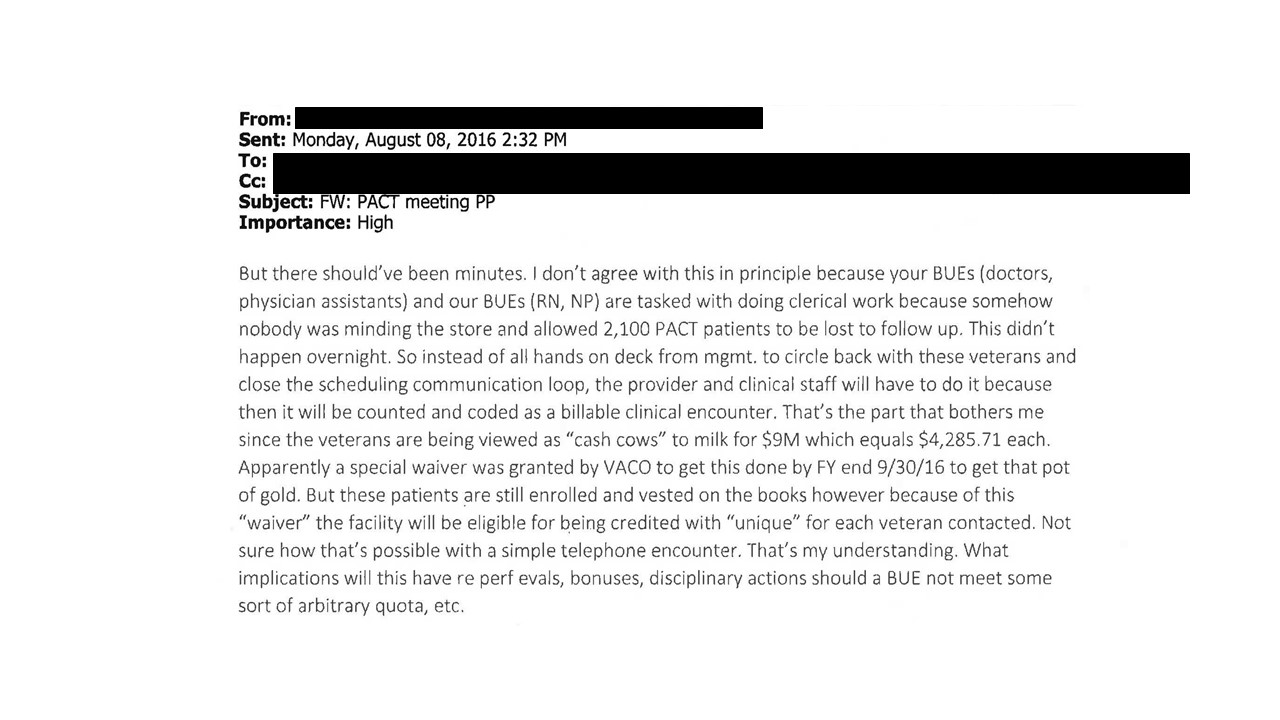 Internal documents show that the “patient engagement project” had reached a few hundred veterans by September 2016, and thus secured more than $800,000 for the Northport clinic.