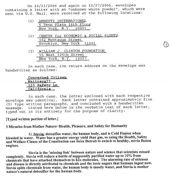 In addition, envelopes containing an “unknown white powder” received by the Clinton Foundation (as well as Amnesty International and the Center for Economic and Social Rights) in October 2006 included a letter extolling the virtues of the sugar substitute “Stevia,” among other things (screen capture here):