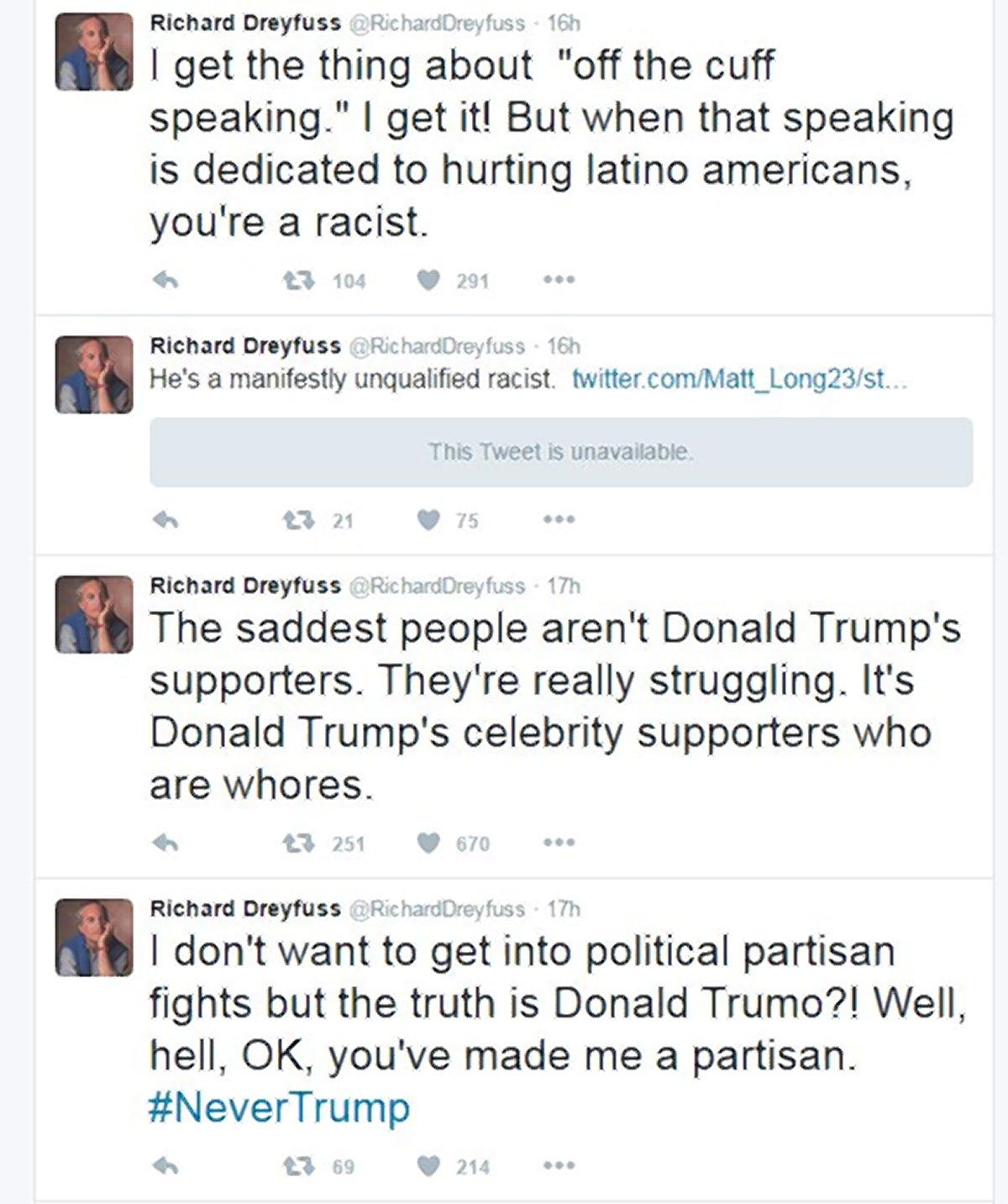Actor Richard Dreyfuss was slammed after calling celebrities who support Donald Trump “whores.” The actor deleted the Twitter posts Tuesday shortly after the tirade.