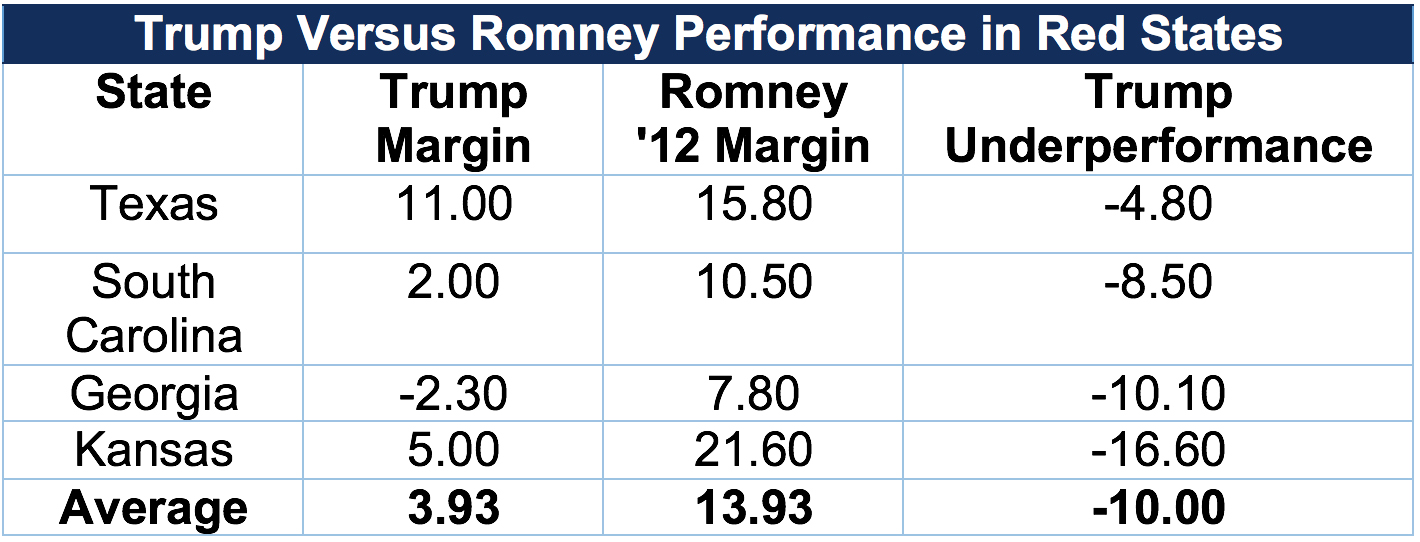 This is a substantial underperformance by the Republican nominee. Clinton looks to have corralled much of the Democratic vote in these states, but a good chunk of Republicans are holding out on Trump.