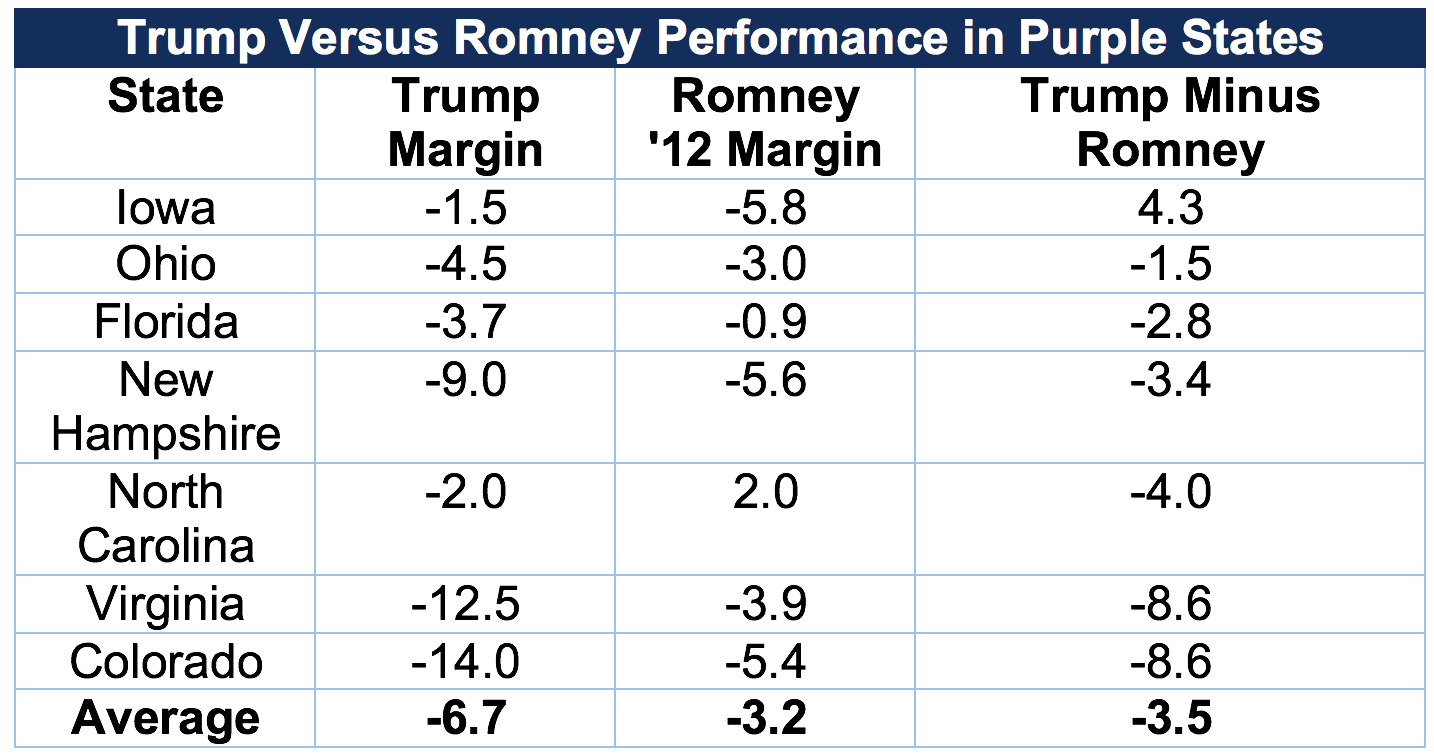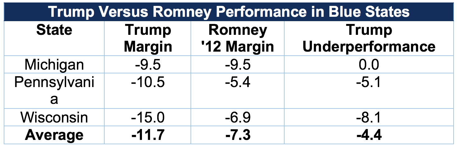The historically blue states show a near-identical portrait, with Trump running solidly behind Romney. The Trump Team continues to talk about Pennsylvania as if it is in play—at the moment, it clearly is not.