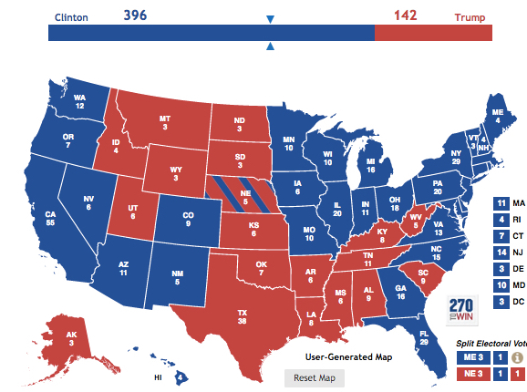 How does all of this factor into the Electoral College? If these numbers hold, all of the purple states would easily fall into Clinton’s column. Similarly, the blue states would remain solidly blue. Moreover, Trump would shed several states that have historically been reliably Republican. If he underperforms Romney by 10 points in red states on Election Day, this is what the Electoral College map would look like.