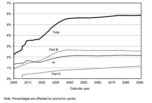 As the population ages and the Medicare population, which covers adults 65 and older, continues to grow, costs will increase gradually to about 5.9 percent of the gross domestic product by 2091.