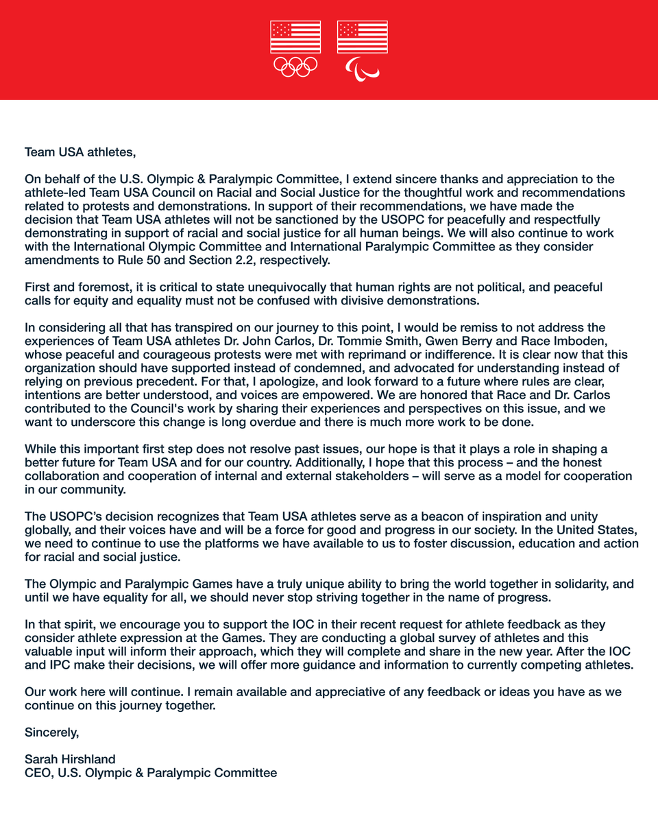 The statement from USOPC CEO Sarah Hirshland continued: “The USOPC’s decision recognizes that Team USA athletes serve as a beacon of inspiration and unity globally, and their voices have and will be a force for good and progress in our society. In the United States, we need to continue to use the platforms we have available to us to foster discussion, education and action for racial and social justice.”