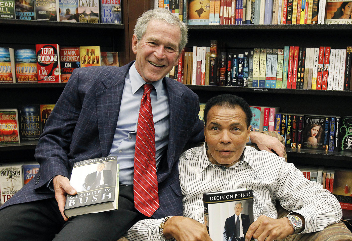 Former President George W. Bush, left, sits with former world boxing champion Muhammad Ali during a book signing for the former president’s book “Decision Points” at a Barnes & Noble Booksellers store in Phoenix, Dec. 9, 2010. (AP Photo/Ross D. Franklin)