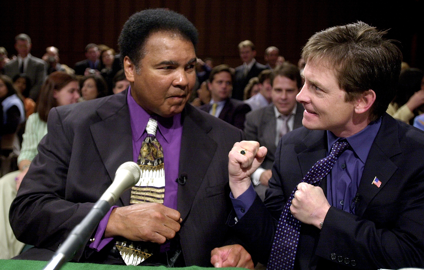 Muhammad Ali and actor Michael J. Fox joke around before the start of a Senate hearing on Parkinson’s Disease in 2002. (AP Photo/Kenneth Lambert)