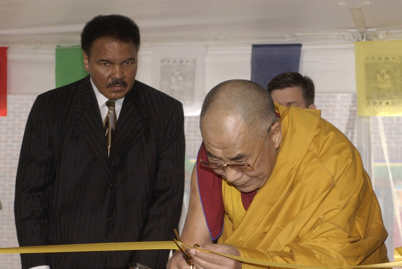 The Dalai Lama cuts the ribbon during the dedication ceremony of the new interfaith temple at the Tibetan Cultural Center in Bloomington, Ind., with Muhammad Ali in 2003. (AP Photo/Darron Cummings)