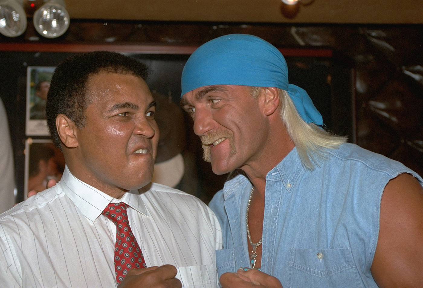 Muhammad Ali stares down wrestling’s Hulk Hogan in 1993. (AP Photo/Richard Drew)