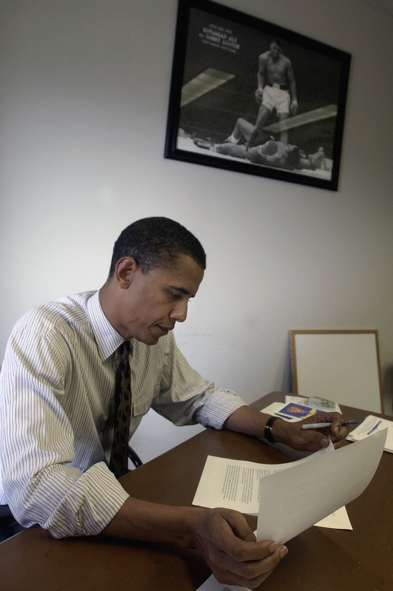 Then-Democratic Senate nominee Barack Obama, working near a photo of a victorious Muhammad Ali standing over his challenger, reads through his keynote address that he is to deliver to the Democratic National Convention in Chicago in 2004. (AP Photo/M. Spencer Green, File)