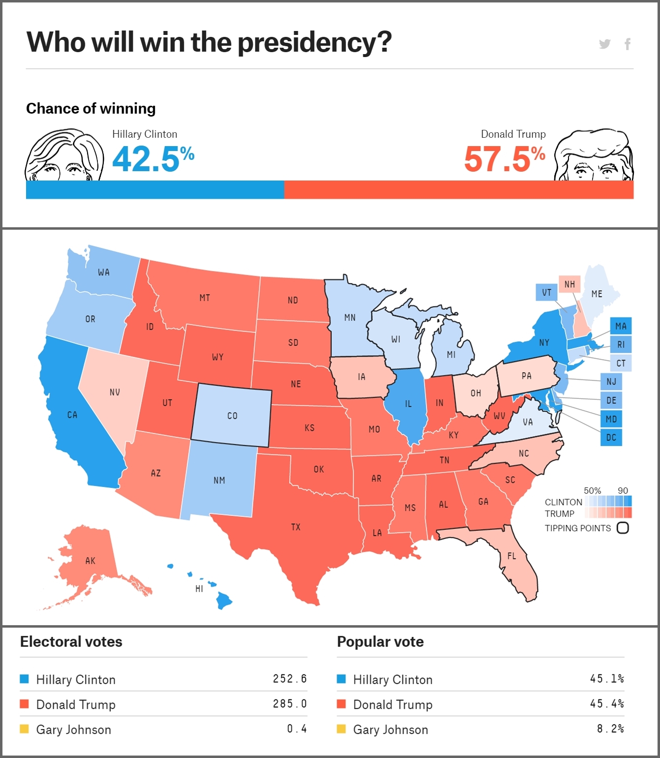 The “now cast” model also predicted Trump would beat Hillary in electoral votes — 285 to 252.6 — and that he would win in the popular vote by 45.4 percent to 45.1.