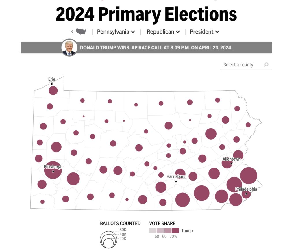 “President Trump continued his winning streak and delivered a resounding primary win in Pennsylvania,” said Karoline Leavitt, national press secretary for the Trump campaign.