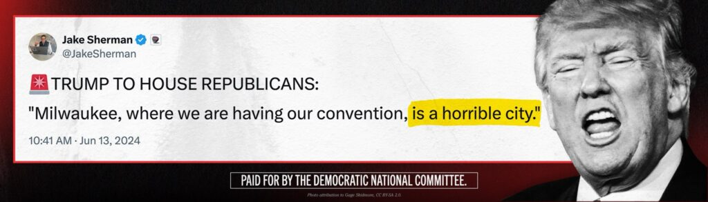“Donald Trump has made his contempt for Wisconsinites and their home clear,” DNC spokeswoman Addy Toevs said in a statement. “Just yesterday, he called Milwaukee — which will host the RNC in July — a ‘horrible city.’ The dislike is mutual — in 2020, Wisconsin handed Trump a one-way ticket back to exile in Mar-a-Lago and sent President Biden to the Oval Office. In November, they’ll do it again.”