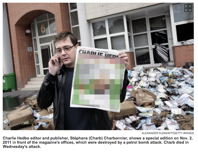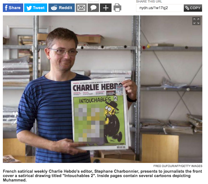 In reporting on the Charlie Hebdo terrorist attack, the Daily News refused to publish images of the supposedly offensive cartoons that prompted the mass slaughter. Rather, in every visual reference to the French magazine’s artwork, the Daily News was careful to censor anything that could be seen as offensive to those who carried out the attack.
