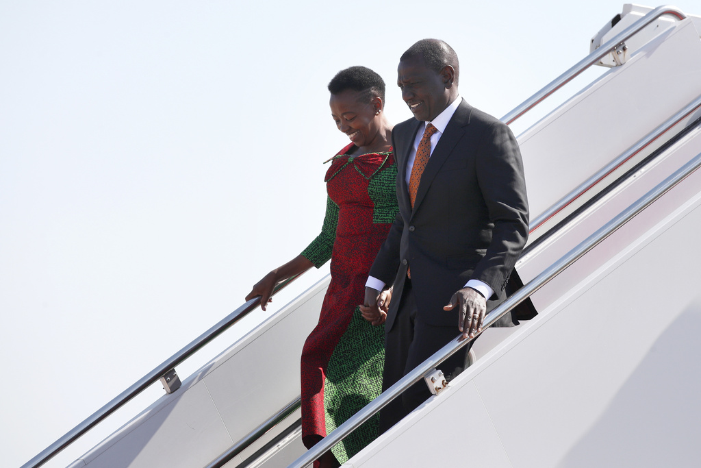 Kenya’s President William Ruto, right, and first lady Rachel Ruto arrive at Andrews Air Force Base, Maryland, Wednesday, May 22, 2024, for a state visit to the United States. (AP Photo/Luis M. Alvarez)