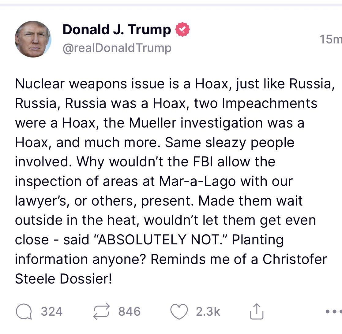 “Nuclear weapons issue is a Hoax, just like Russia, Russia, Russia was a Hoax,” Trump said in a post on his social media platform Truth Social. “Two Impeachments were a Hoax, the Mueller investigation was a Hoax, and much more. Same sleazy people involved. Why wouldn’t the FBI allow the inspection of areas at Mar-a-Lago with our lawyer’s [sic], or others, present. Made them wait outside in the heat, wouldn’t let them get even close — said ‘ABSOLUTELY NOT.’ Planting information anyone?”
