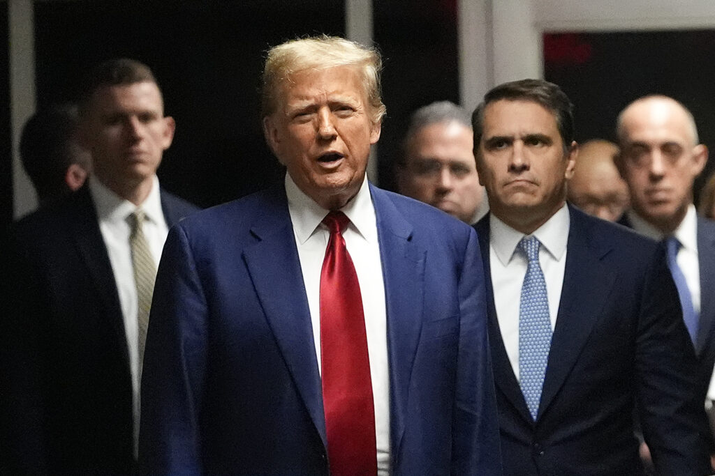 Former President Donald Trump comments as he returns for a pretrial hearing after a recess at Manhattan Criminal Court, Monday, March 25, 2024, in New York. A judge will weigh on Monday when the former president will go on trial. (AP Photo/Mary Altaffer)