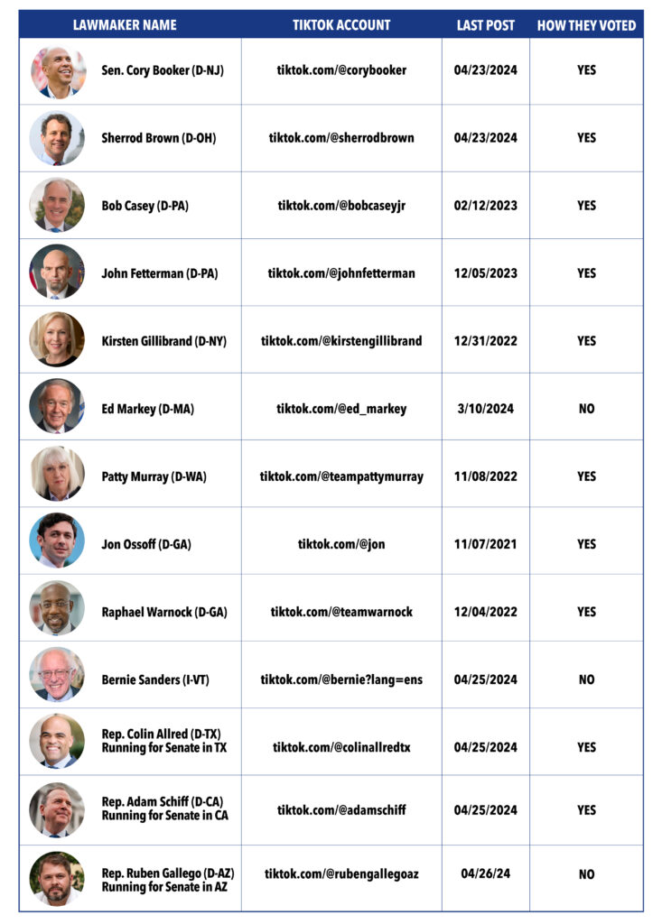 In battleground states that are at stake in the upper chamber, Sens. Sherrod Brown (D-OH) and Bob Casey (D-PA) have accounts on the platform. Reps. Colin Allred (D-TX) and Ruben Gallego (D-AZ) also have accounts and are running in competitive races this November. However, Gallego voted against a prior stand-alone TikTok bill but then voted for the larger foreign aid bill, which included the provision involving the social media platform.