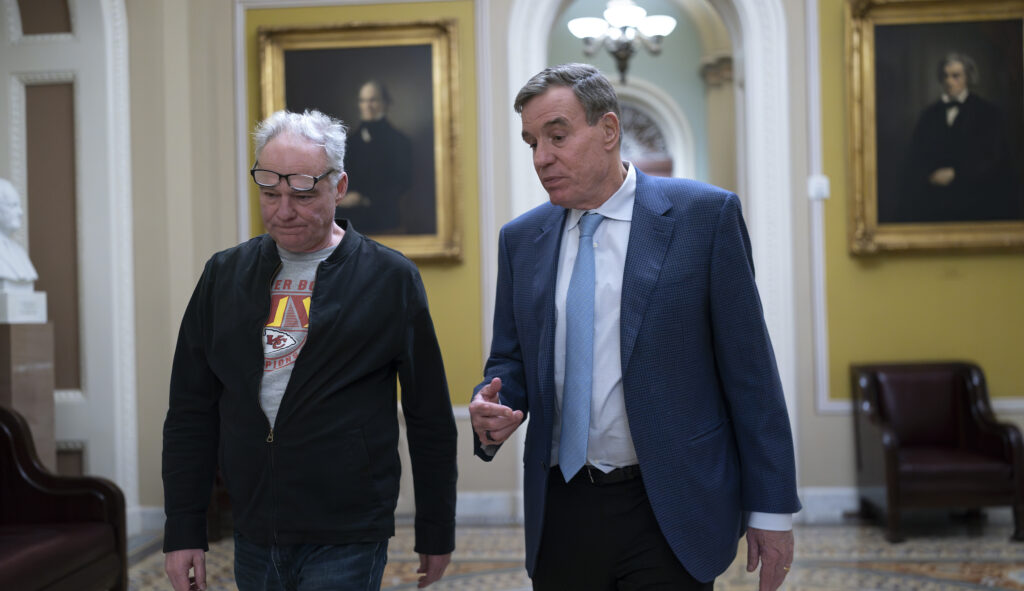Sens. Tim Kaine (D-VA), left, and Mark Warner (D-VA) arrive as the Senate holds a procedural vote on a package of wartime funding for Ukraine, Israel, and other U.S. allies, at the Capitol in Washington, Friday, Feb. 9, 2024. (AP Photo/J. Scott Applewhite)