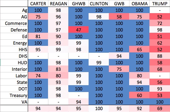 It’s at this point we can begin to view Senate support for the president’s selections in a historical context. George H.W. Bush retained his predecessor’s top Treasury official, and there were no Homeland Security or Veterans Affairs posts in the Reagan and Carter years. Each of these three presidents had 13 cabinet secretaries of what constitutes the current 15-member arrangement, exactly the same number as Trump has now.