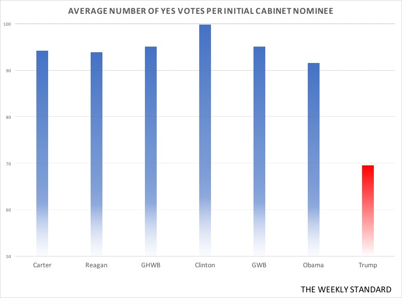 What is notable is not even the selections of President Obama, for all the famous Republican dissent his administration tracked in, bore such numerous objections from the opposition party. His typical cabinet nominee earned 92 backers, fractionally lower than the norm. Much of that was due to him having two especially controversial picks, at Treasury amid the financial crisis and HHS after former Sen. Tom Daschle dropped out of the running, where most new presidents max out at one, if any.