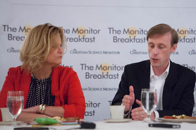 Clinton aides Jennifer Palmieri and Jake Sullivan at a media breakfast hosted by the Christian Science Monitor. Bryan Dozier/The Christian Science Monitor
