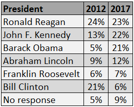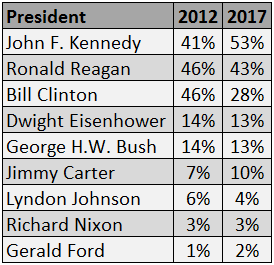 Only Clinton suffered such as drop in the survey, and one, John F. Kennedy soared to the top.