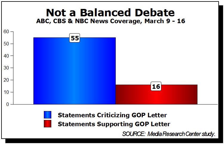 A new study by the Media Research Center found that ABC, CBS and NBC gave three times more coverage to critics of the letter signed by 47 senators and warning Iran of the GOP questions the pending nuclear deal.