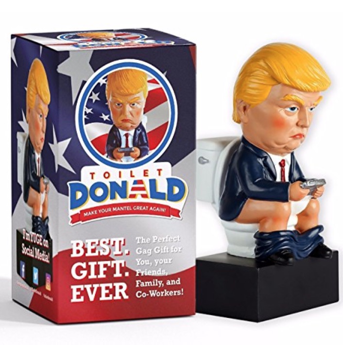 • Just in time for Christmas, this year’s political gag gift is “Toilet Donald,” a ceramic doll of the president in the bathroom and tweeting. “Make your mantle great again!” reads the box, which includes a Trumpian boast, “Best. Gift. Ever.” …