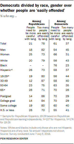 What’s more, said Pew Research Center, a huge majority of Republicans, 78 percent believe people are too offended but 61 percent of Democrats want people to police their words.