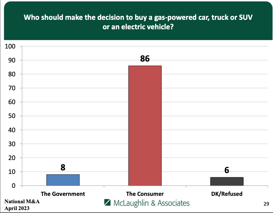 President Joe Biden wants all of us out of gas- and diesel-fueled cars and trucks and humming around in EVs by 2032. But pollsters John and Jim McLaughlin said we don’t want to give up our gas guzzlers. Polling they revealed to Secrets said that by a 2-1 margin, the public doesn’t want to be forced into electric vehicles. And 86% don’t think Washington should tell people what to drive.