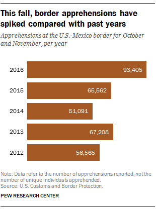 According to Pew Research Center analysis, the apprehensions follow an already record-breaking fiscal year, which ended in September, when 408,870 were apprehended at the Southwest border.