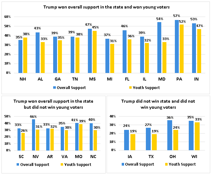 And, said the report, “During the primary season, Donald Trump received a slightly larger proportion of youth votes than the two previous Republican nominees, Senator John McCain (2008) and Governor Mitt Romney (2012). Before all other candidates suspended their campaigns, Trump was receiving an average of 33 percent of youth votes per state, compared to McCain’s average of 29 percent and Romney’s 28 percent in their competitive primaries.”