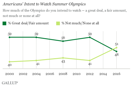 “For the first time since Gallup began asking this question in 2000, Americans are almost evenly split as to whether they will watch the Olympics. The Olympic Games have been a rallying cry for nations since ancient times, and certainly since the modern Olympics resumed in 1896. Yet with concerns about the Zika virus keeping many American athletes at home, on top of allegations of drug use among participants and recent reports of unsafe conditions in the Olympic Village, Americans seem to have lost interest.”