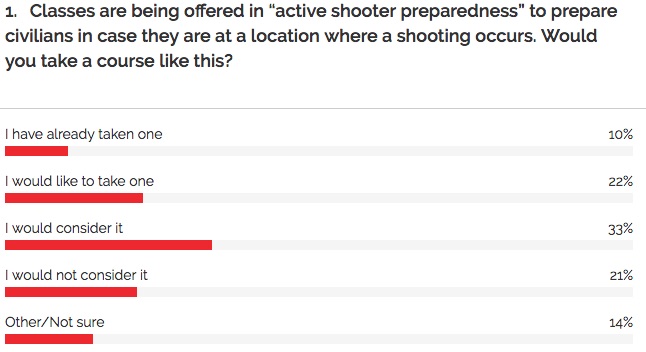 “Research from YouGov Omnibus reveals that 22 percent of Americans say they would like to take such a class and a third (33 percent) say they would consider it. Two in ten (21 percent) say that they wouldn’t consider take an active shooter class.