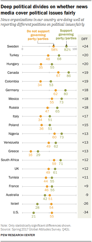 “Large gaps in ratings of the media emerge between governing party supporters and non-supporters. On the question of whether their news media cover political issues fairly, for example, partisan differences appear in 20 of the 38 countries surveyed. In five countries, the gap is at least 20 percentage points, with the largest by far in the U.S. at 34 percentage points,” said Pew.