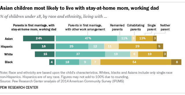 Asian children are the most likely to live in traditional families, at 24 percent. Another 47 percent live with their parents, but not in the typical mom-at-home, dad-at-work situation.