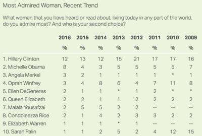 “Clinton may have a better chance of staying most admired woman based on history. Former first ladies have won the title more than any other role — 35 times in the 67 years the question has been asked. Most of those wins are for Roosevelt and Clinton, but Mamie Eisenhower, Kennedy and Betty Ford also won after their husband’s term ended. Clinton may also be advantaged in the future because she will be in a less overt political role. Her highest favorable ratings to date came when she was first lady and secretary of state, while they fell significantly during her two presidential campaigns,” said Gallup.