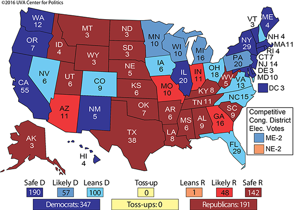 “Election analysts prefer close elections, but there was nothing we could do to make this one close. Clinton’s total is 347 electoral votes, which includes 190 safe, 57 likely, and 100 that lean in her direction. Trump has a total of 191 (142 safe, 48 likely, and 1 leans),” said the authors of the report posted on the weekly “Crystal Ball,” from UVA’s Larry J. Sabato, Kyle Kondik and Geoffrey Skelley.