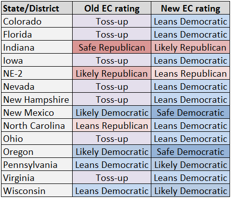 What’s more, while the prior map showed 85 votes “up for grabs” in states like Florida, Colorado, Ohio and Virginia, the new map has no toss up states, with those four now in the “leans Democratic” category.
