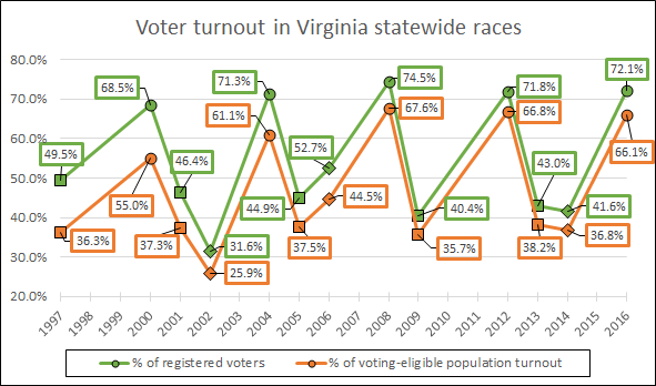 A concern for the Northam campaign has to be the recent history of polling in Virginia and nationally that has missed some conservative voters. For example, the final RealClearPolitics average in 2013 showed McAuliffe leading Ken Cuccinelli (R) 45.6%-38.9%, with Libertarian Robert Sarvis getting 9.6%. Although McAuliffe led by 6.7 points, he only won by 2.5 on Election Day, 47.7%-45.2%. Some of that was Sarvis’ slide to 6.5%, as it’s likely that some Republican voters considering Sarvis came home to the GOP in the end (some of Sarvis’ purported voters probably failed to show on Election Day, too). In 2017, there’s also a Libertarian candidate, Cliff Hyra, though he looks set to win a far smaller share of the vote than Sarvis did. Nevertheless, Cuccinelli’s actual percentage was 6.3 points higher than his polling average while McAuliffe’s was only 2.1 points higher. We’ve seen this phenomenon in recent races, most notably some swing states in the 2016 presidential race, but also in contests like the 2015 Kentucky gubernatorial election. What Northam has to hope for is that with a different party holding the White House, the polls are either on the mark or they underestimate Democrats, not Republicans.