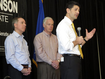 House Speaker Paul Ryan joins Wisconsin state Assembly Speaker Robin Vos, left, and Sen. Ron Johnson, R-Wis., center, at a campaign rally for Johnson on Thursday, May 5, 2016. AP Photo.