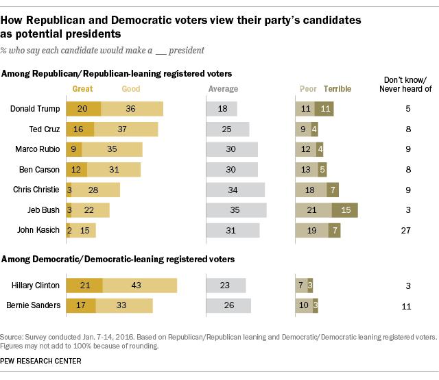 Just 11 percent of voters believe that Republican Donald Trump and Democrat Hillary Clinton would make “great” presidents, with far more believing that the duo would be poor to “terrible” in the Oval Office, according to a new Pew Research Center poll.
