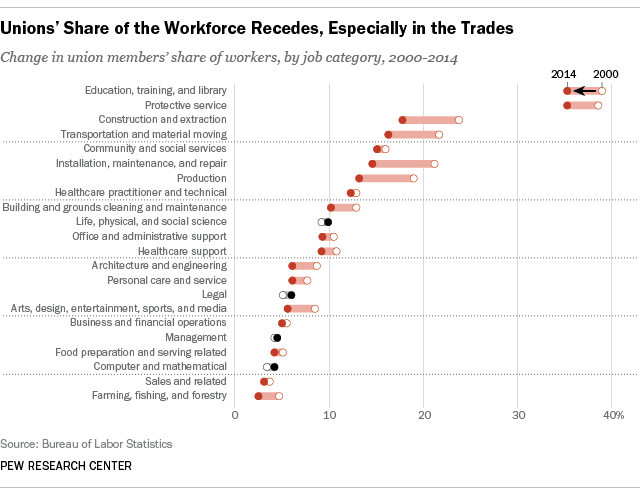 Pew also found that most sectors of workers that have unions are down. The exceptions are in the legal field, management, computer and mathematical jobs, and life, physical and social science occupations.