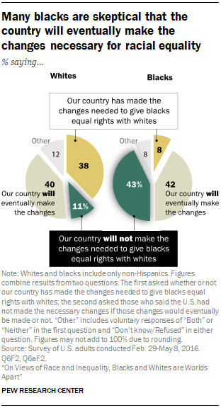— A much lower share of whites (53%) say the country still has work to do for blacks to achieve equal rights with whites, and only 11% express doubt that these changes will come.