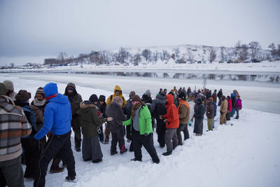 A procession makes its way down to the Cannonball River to take part in a Native American water ceremony at the Oceti Sakowin camp where people have gathered to protest the Dakota Access oil pipeline in Cannon Ball, N.D., Thursday, Dec. 1, 2016. (AP Photo/David Goldman)