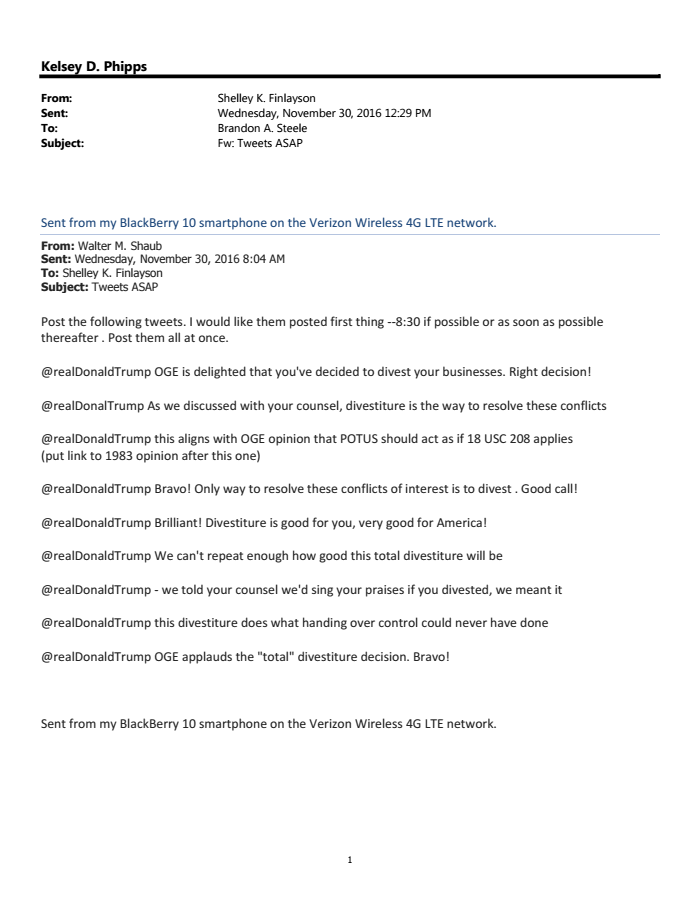 NPR reported that Schaub was behind the tweets, even listing nine he demanded his OGE staff post.