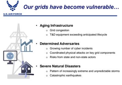 In an Air Force briefing provided to the Examiner, the service raised concerns about “aging infrastructure,” a “growing number of cyberattacks” on the grid, “coordinated physical attacks on key grid components” and “risks from state and non-state actors,” presumably such as the Islamic State or North Korea.