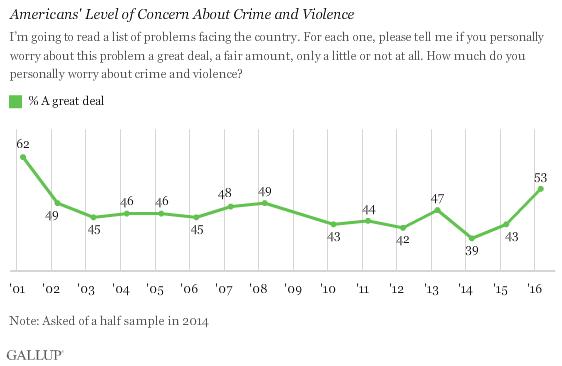 The increase in concern about crime and violence follows recent terrorism killings and the riots in Baltimore a year ago.
