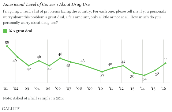 What’s more, Gallup found a big surge in people who are concerned about drug use, likely driven by the heroin epidemic stinging the nation, gang activity, and the surge in the release of drug convicts from jail.