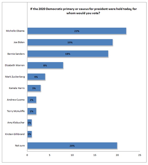 The survey concludes this way: “Although Michelle Obama is extremely popular with the American people, there has been no indication she will run in 2020. The numbers here do show friction within the party, but Obama is a nice name to have on the back burner. It’s too early in the process to select a nominee, and one fifth of Democratic voters are still undecided. But anything can happen in the next three years, and Michelle Obama as the prospective nominee elicits the most excitement on the left.”